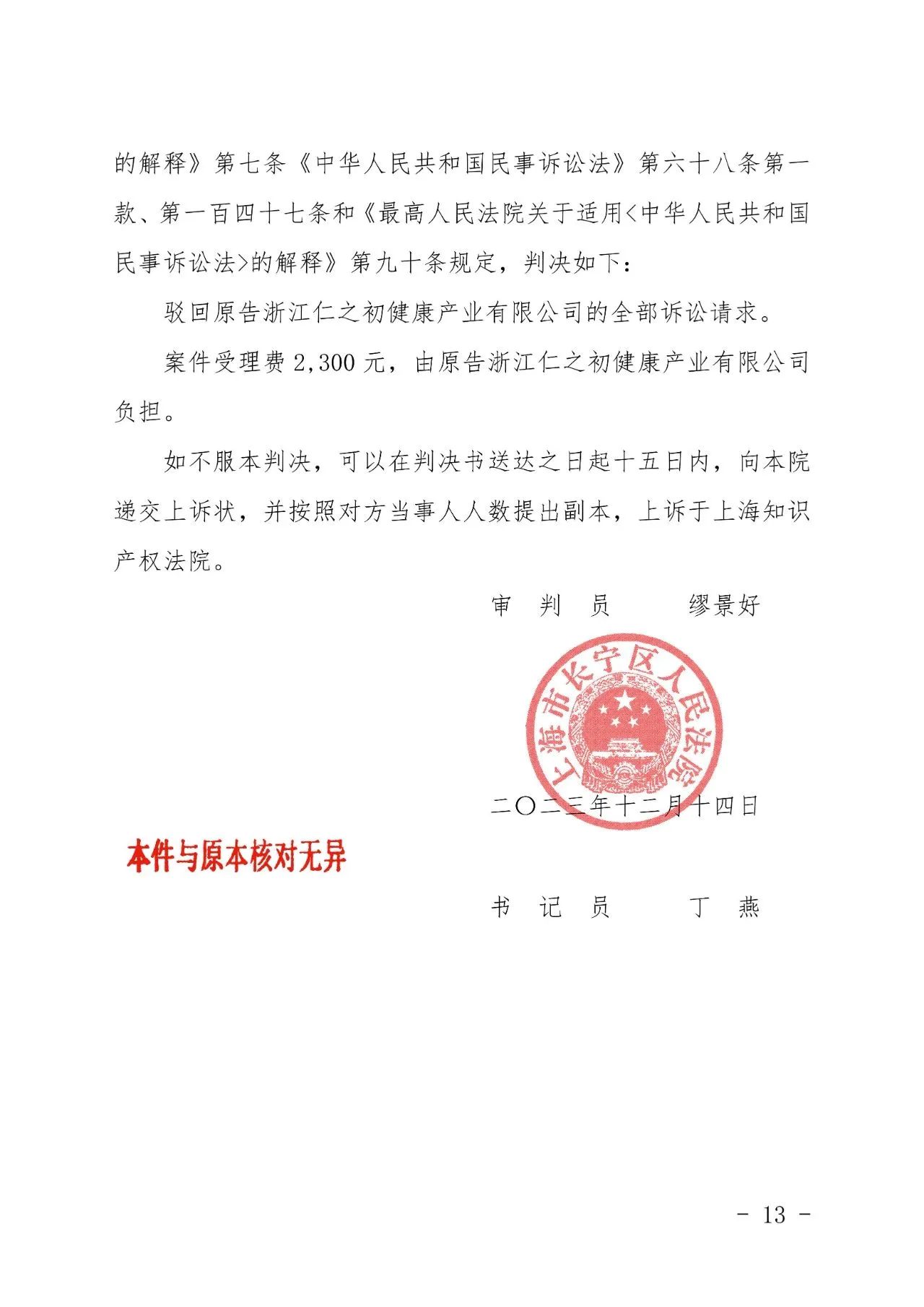 阿里辉知胜诉佳讯 | “仁之初健康”著作权及不正当竞争纠纷案,法院:驳回全部诉讼请求!